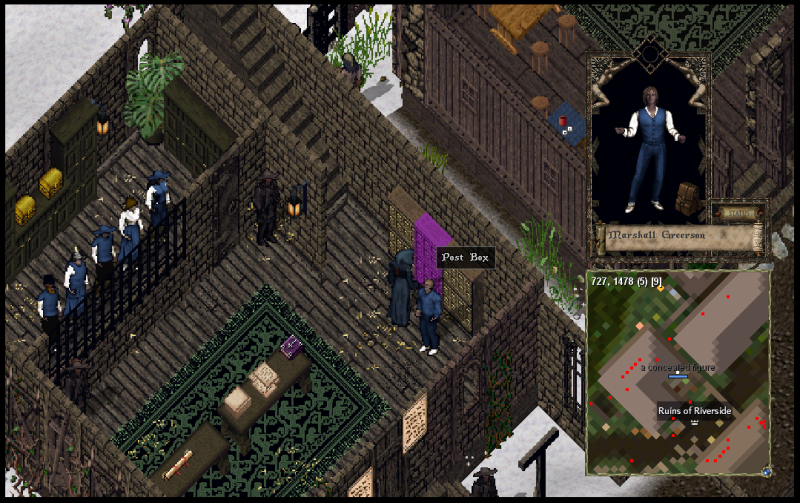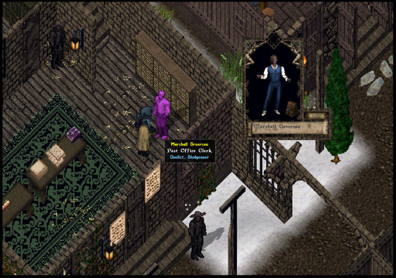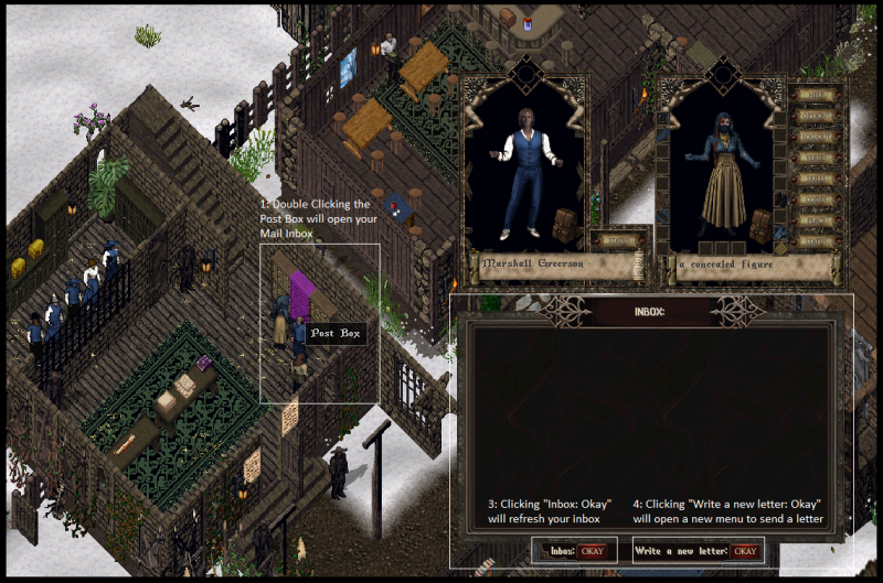 Every major settlement is provided with a Post Office which Characters can access to send and receive letters, along with items or coin.