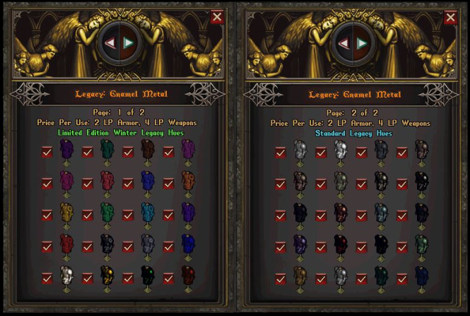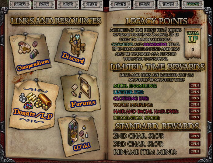 Players can spend Legacy Points to acquire vanity role play items so they can expand upon their world in a myriad of ways. From custom decoration items to beautiful dye colors for hair, furniture, clothing, leather and metal weapons / armour, Or even giving an item a special name for RP purposes, You will have plenty of options to enrich your character's life (and everyone else).