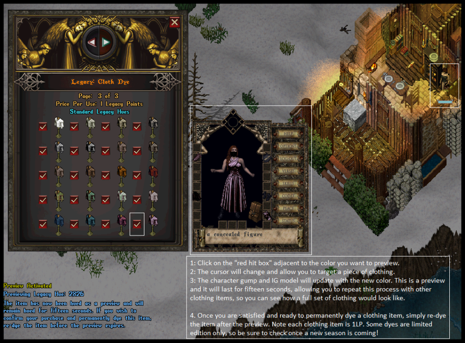 3: The character gump and IG model will update with the new colour. This is a preview and will last for fifteen seconds, allowing you to repeat this process with other clothing items, so you can see how a full set of clothing would look like.