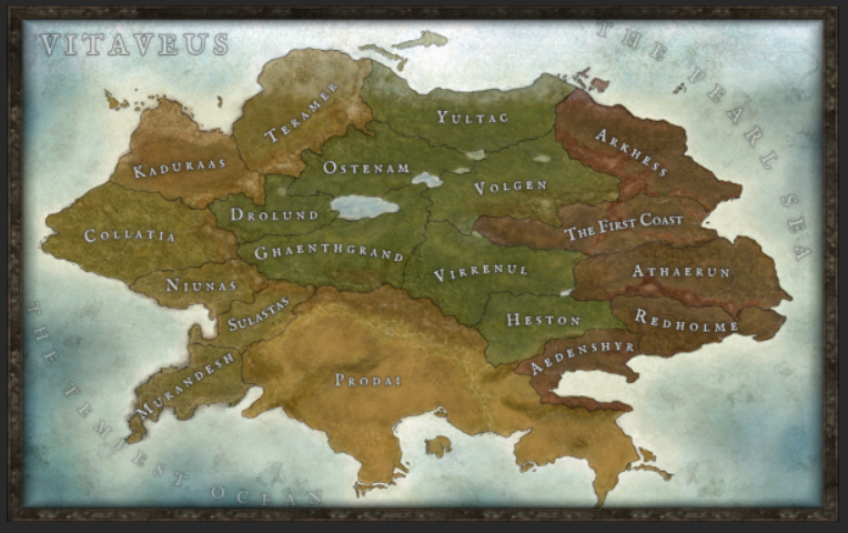 Prodai, though a desert climate, once held a wealth of forested lands that hugged the southeastern edges of its mountain barriers. However, over the generations of expansion on behalf of its ancient priest royalty and their great architectures to venerate their wretched, pagan gods, they had exhausted these natural resources completely, which resulted in many of their civilizations and cities to become empty husks where life once thrived. The sweltering desert landscape has swallowed up these ancient places, burying them beneath the hot Prodain sands as time has taken its toll. The Prodai region is predominantly flat at its center, becoming more pronounced as you reach the foothills along the mountains that encompass almost all of its border. Almost in the center of this barren waste is a massive scar that plunges deep into Eden and stretches further than the eye can see; its depths craggy and torn, and one false step could be the undoing of any mere mortal foolish enough to get close to its edge. Boasting the largest territorial claim of any region within Vitaveus, Prodai's legacy is as lengthy and large as it's vast, rolling deserts.